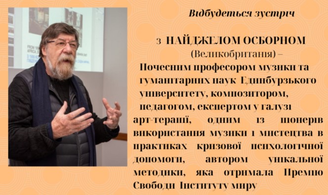 16 та 17 листопада 2023 року студенти спеціальності 227 Терапія та реабілітація разом із викладацьким колективом кафедри терапії та реабілітації мали нагоду поглибити свої теоретичні та практичні знання в галузі арт-терапії. Лекції та практичні заняття проводив професоро Единбурзького університету Найджел Осборн – музикант, композитор, педагог, музичний терапевт. Професор Осборн – непересічна особистість, людина з вражаючою біографією, широкою ерудицією, глибокими знаннями і великим серцем. Викладачі і студенти мали унікальну можливість послухати про його досвід роботи в найгарячіших точках світу, побачити і почути – як нашу професію можна використати для допомоги суспільству, особливо тим, кому вона найнеобхідніша. Гостьові лекції відбувалися за організації та підтримки навчально-наукового інституту мистецтв нашого університету.