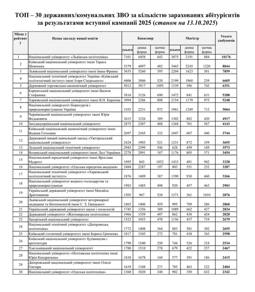 За даними ЄДЕБО, Карпатський національний університет імені Василя Стефаника посів 6 місце серед державних і комунальних закладів вищої освіти України за кількістю зарахованих абітурієнтів у 2025 році.